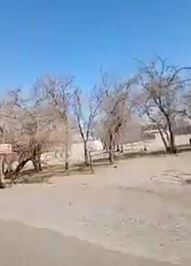 street scene, likely taken from a moving vehicle. The sky is clear and blue. At the start, there is a green sign that reads "ZONA POBLADA." The roadside is dirt and gravel, with some barren-looking trees. The video then shows a sign advertising "CEMENTO BLOQUETAS CADENAS" in Spanish. A speed limit sign indicating 60 kilometers per hour is also visible. The area appears to be a lightly populated residential area with fences, utility poles, and some small buildings visible in the background. The sound suggests wind noise.