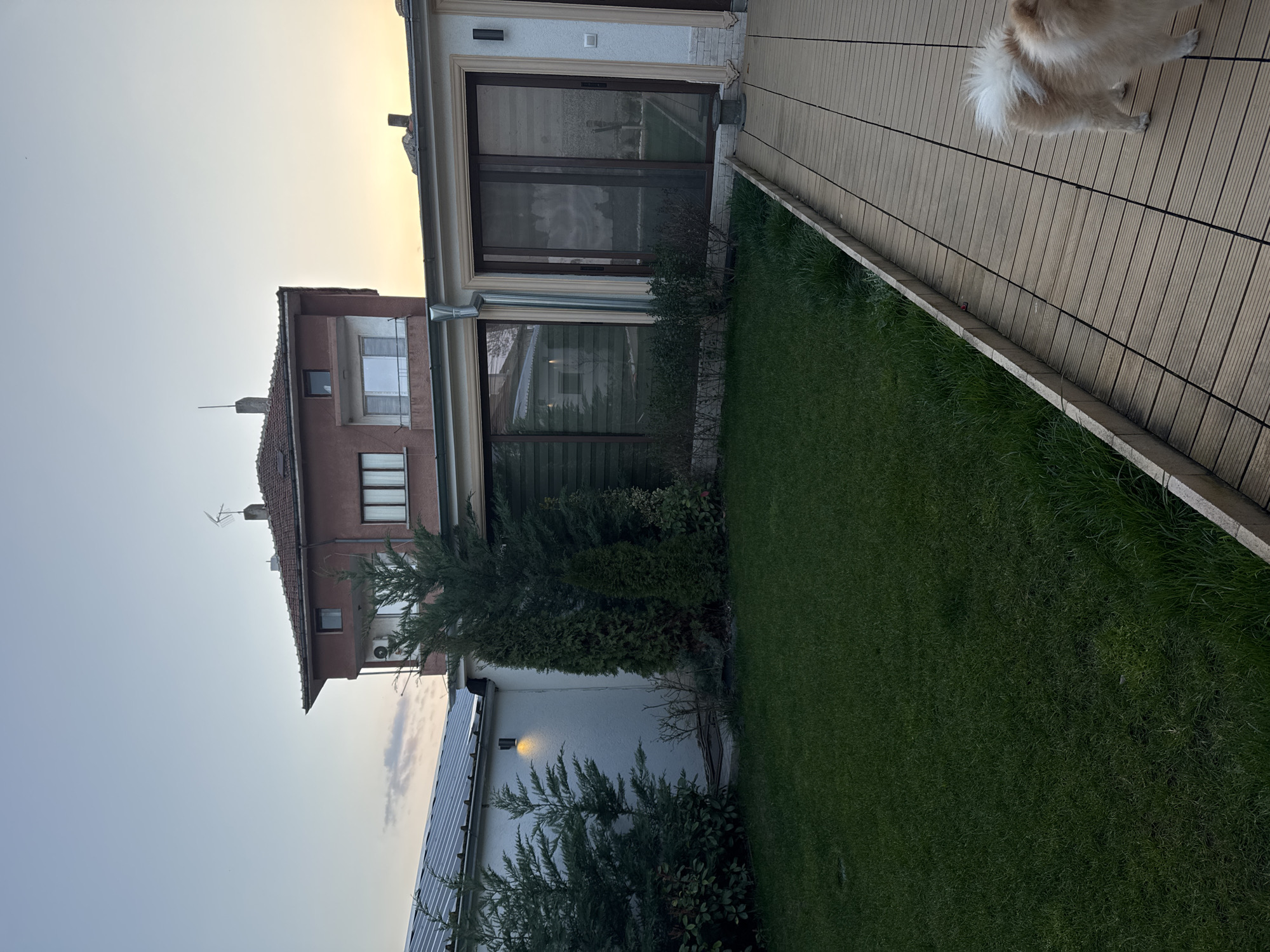 The image depicts a residential backyard scene in Svilengrad, Bulgaria, captured during dusk or late afternoon hours. The sky above is clear, displaying a pale blue hue that transitions to a yellowish-orange near the horizon on the right. In the foreground, a light-colored, fluffy canid, consistent with a Pomeranian breed, with cream and white fur, is partially visible from its rear, facing away from the viewer. This animal is positioned on a light brown composite decking pathway that occupies the lower right portion of the image. The decking pathway runs parallel to a concrete border separating it from a dark green, well-maintained grass lawn that covers the central and left midground. Along the left side of the lawn, a white stuccoed wall rises, featuring an illuminated outdoor wall light emitting a warm yellow glow. Above this wall, a roof section equipped with dark solar panels is partially visible. Evergreen trees and various shrubs are planted along the base of the white wall. To the right of the lawn, a building section with a white stucco facade, accented by light beige decorative molding, is visible. This section includes two large, dark-framed sliding glass doors or windows that reflect elements of the surroundings. A vertical metal downspout runs between these two large openings. A small collection of low-lying shrubs is situated in a garden bed directly in front of this building section. A dark grey cylindrical object rests on the decking near the rightmost sliding door. In the background, a two-story residential building with a reddish-brown stucco exterior and a red tiled roof is prominent. This structure features multiple windows, including a white-framed enclosed balcony or large window unit on the second floor, below which an external air conditioning unit is mounted. A brick chimney, topped with a metallic antenna, is visible on the roof.