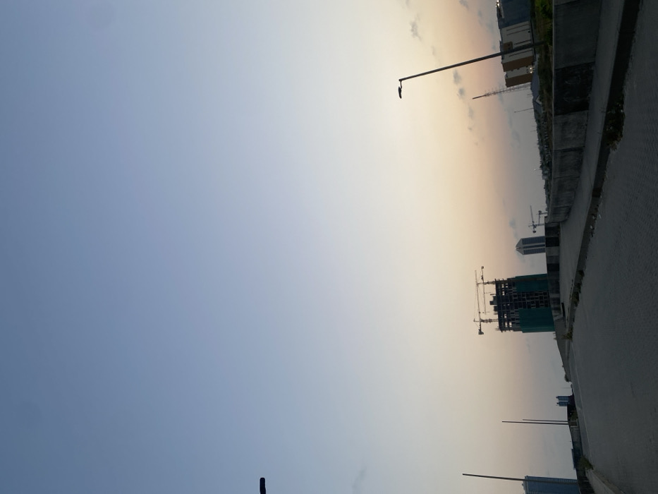 The image showcases a clear blue sky transitioning to a pale orange sunset near the horizon. A concrete road runs along the right side, bordered by a low concrete wall. A building under construction, complete with multiple cranes, is visible against the sunset backdrop. Other buildings and a few lamp posts dot the skyline, adding to the urban landscape.