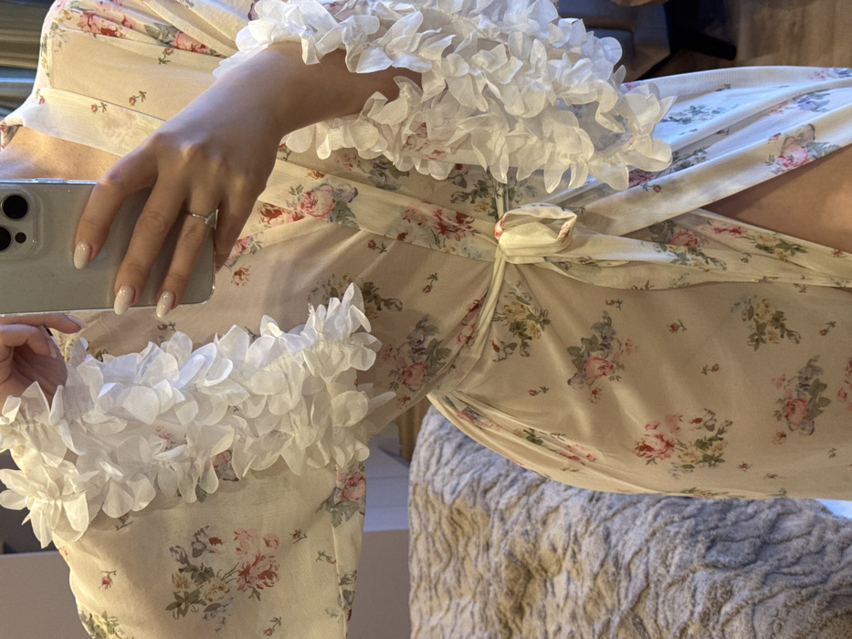 The image depicts an indoor scene in the city of Mishkino, Russia, specifically appearing to be a private room such as a bedroom or hotel room. A human figure, partially visible, is taking a mirror selfie, with their face obscured by a smartphone. The person is wearing a light-colored, full-length wrap-around robe or kimono. The fabric features a floral pattern consisting of pink, red, and green roses and foliage against a cream or pale beige background. Both sleeves are adorned with voluminous, multi-layered white ruffles made of a translucent material, possibly chiffon or organza, extending from the elbow to the wrist. The robe is tied at the waist with a matching fabric sash, creating a knot or bow on the left side of the torso. The individual's right hand is holding a smartphone, which is angled to capture the reflection. The phone's camera array, consistent with an iPhone, is visible. The fingernails on the visible hand are manicured and painted with a light, opaque polish. A thin, metallic ring with a small, clear stone is present on the ring finger of the right hand. In the background, to the left of the figure, a textured, plush surface, consistent with a bedspread or blanket on a bed, is visible. The remainder of the background is blurred and indistinct, indicating an interior setting.