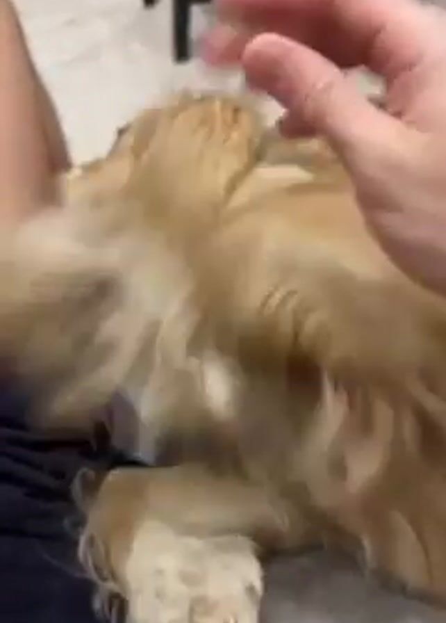 person sitting on a gray floor with their knees bent and their legs slightly apart. A tan, long-haired dog is lying on the person's lap, facing away from the camera. The person's hand is gently stroking the dog's fur. In the background, there is a black wooden stool. The lighting is indoor, and the overall setting appears to be a casual domestic environment.
