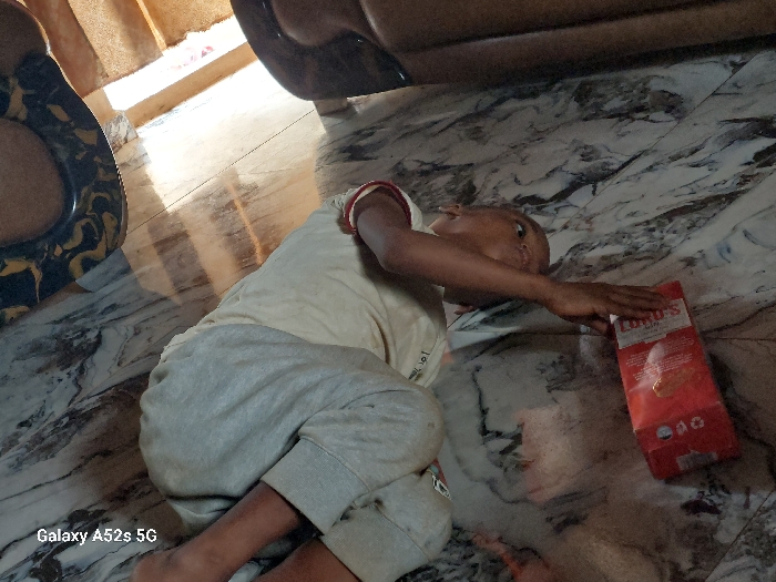 An individual, likely a child, is observed lying on their left side on a light-colored, marble-patterned tiled floor indoors. The child is wearing a light-colored t-shirt and light grey sweatpants. Their right arm is extended towards a red rectangular box, prominently labeled "LORD'S" in white text, with a circular image of a biscuit or cracker visible on its front. The child's head is turned upwards and to the left, their gaze directed slightly away from the camera. Reflections of light, possibly from a window or overhead fixture, are present on the polished floor, casting striped patterns. A dark, patterned object, possibly part of a piece of furniture, is partially visible in the upper left background. The specific city of Awkuzu, Nigeria, cannot be determined from the visual information provided.