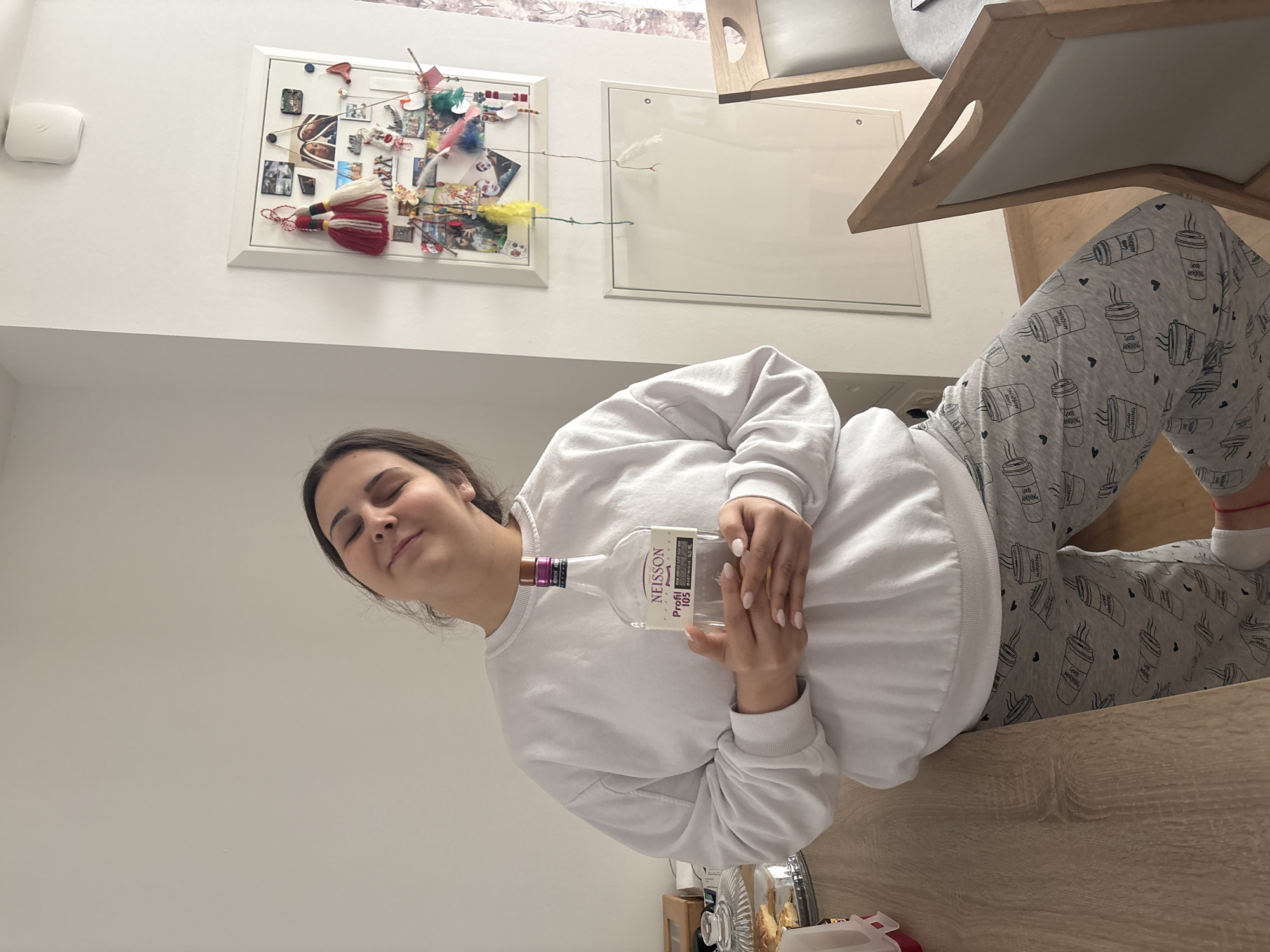 person, presumably female, wearing a white sweatshirt and grey patterned pajama pants, holding a clear glass bottle with a label reading "NEISSON Profil 105." The individual has closed eyes and appears to be smiling slightly. The setting appears to be indoors, possibly a home or apartment. There is a wooden table surface in the foreground. On the wall behind the person, there are a few decorative items including a framed collage or bulletin board and a blank white panel. The city and specific location are unknown based on the image.