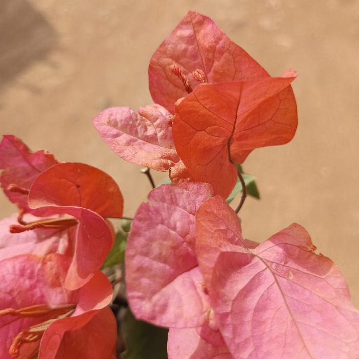 The image presents a close-up view of a bougainvillea plant, located in Jos, Nigeria. The central focus is a cluster of coral-to-salmon-pink colored bracts, each displaying a prominent venation pattern and slight textural variations on its surface. Several small, pale yellow florets are discernible nestled within the bract formations. The background consists of a uniformly textured, out-of-focus beige surface, consistent with an outdoor wall or ground. No individuals, human actions, or additional significant objects are present within the frame. The scene is static and appears to be illuminated by natural light, casting soft, indistinct shadows.