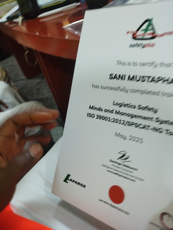 certificate presented to "Sani Mustapha" for completing a "Logistics Safety Minds and Management System" training program, certified by "Safety Plus", with "ISO 39001:2012/SPSCAT-NG Top" standards. The certificate was issued in May 2025 by Lafarge. The certificate is held in a person's hand. The coordinates given (latitude: 10.929, longitude: 11.476) are in Ashaka, Nigeria.