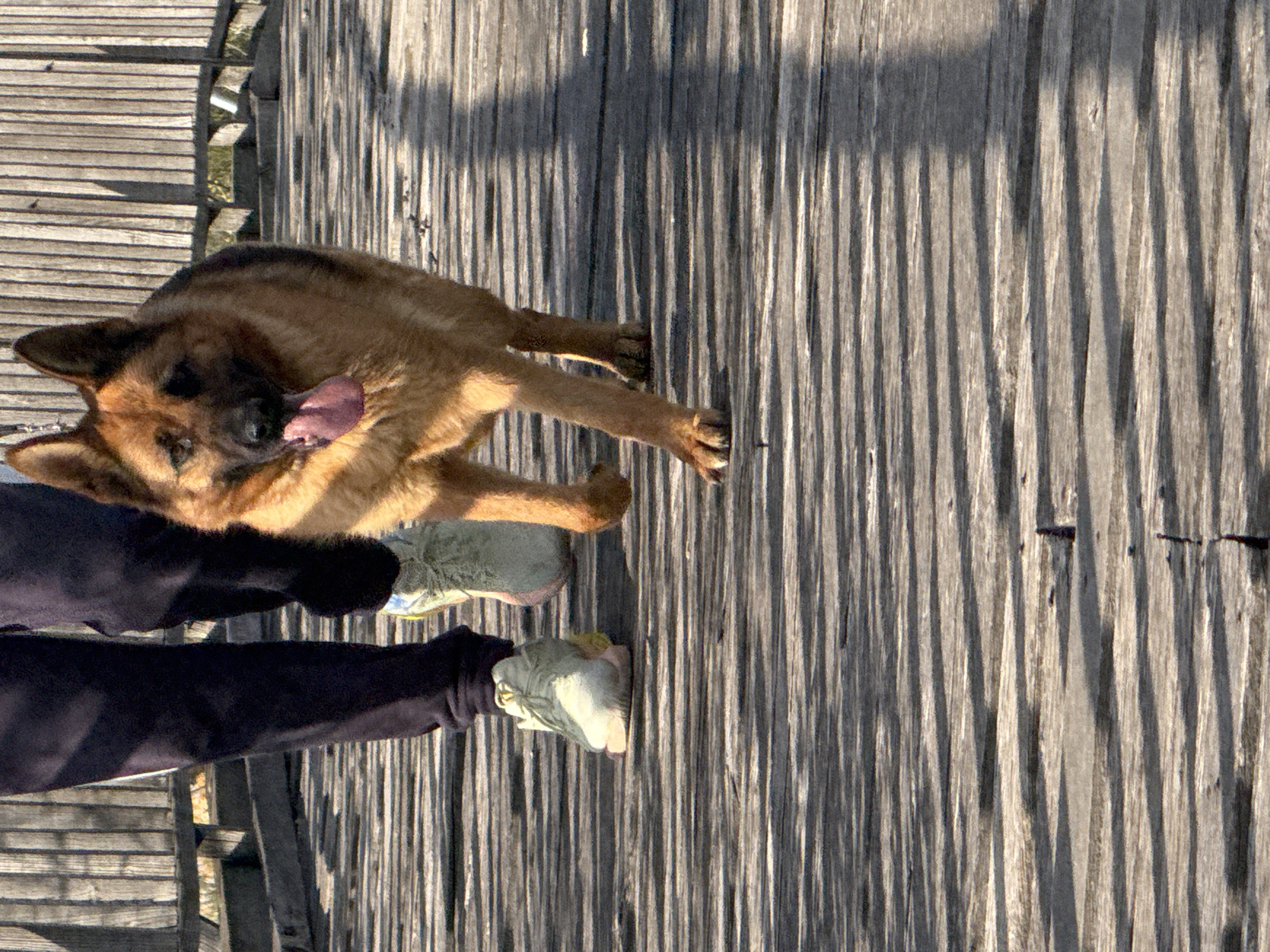 - "A medium shot depicts a person and a German Shepherd dog on a wooden surface, likely a boardwalk or bridge" by FM-7EcLC2, licensed under CC BY 4.0