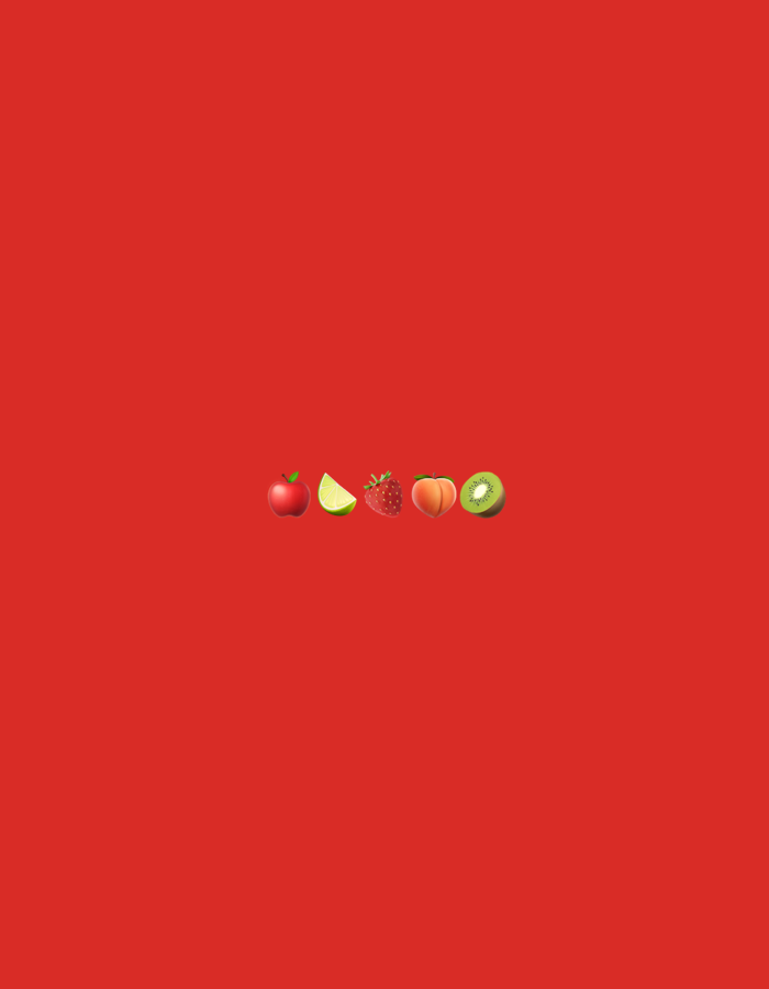 This digital image, located in Netanya, Israel, displays a solid red background. Five distinct fruit emojis are horizontally aligned near the center. From left to right, the emojis are a red apple, a green lime wedge, a red strawberry, an orange peach, and a sliced kiwi. No human subjects, actions, or direct interactions are visible.