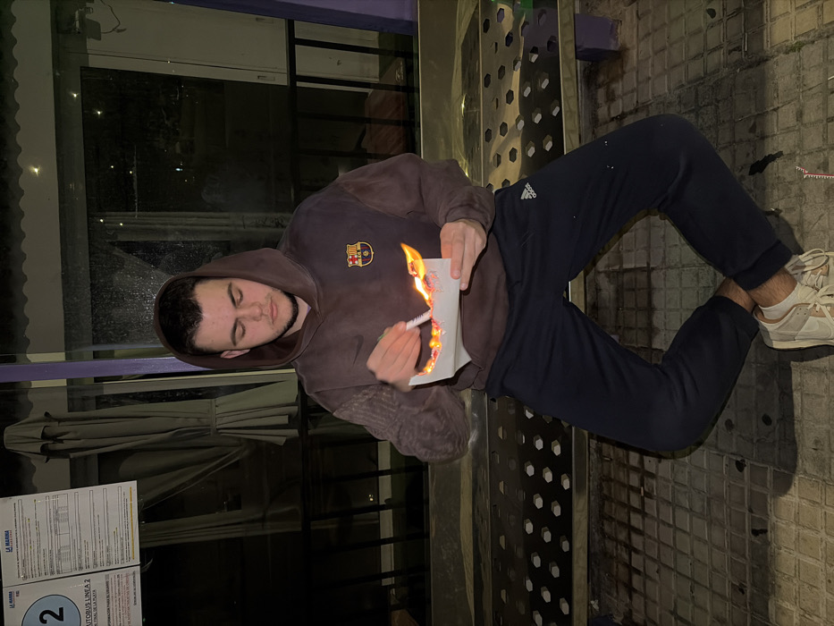 A young male is seated on a metallic, perforated bench at a bus stop in Grau I Platja, Spain, during nighttime. He is wearing a dark brown hooded sweatshirt with a Nike logo and FC Barcelona crest, dark blue Adidas track pants, and light-colored sneakers with white socks. The individual holds a white piece of paper in his left hand that is actively aflame, emitting bright yellow and orange fire. In his right hand, he holds a white cylindrical object, possibly a marker or similar implement, positioned above the burning paper. Behind him, a large glass panel of the bus shelter reflects dim interior lights and allows a view into the dark street or urban landscape beyond. To the upper left, a white sign through the glass displays "LA MARINA" and "AUTOBUS LINEA 2" with additional route information. The ground is paved with grey square tiles.