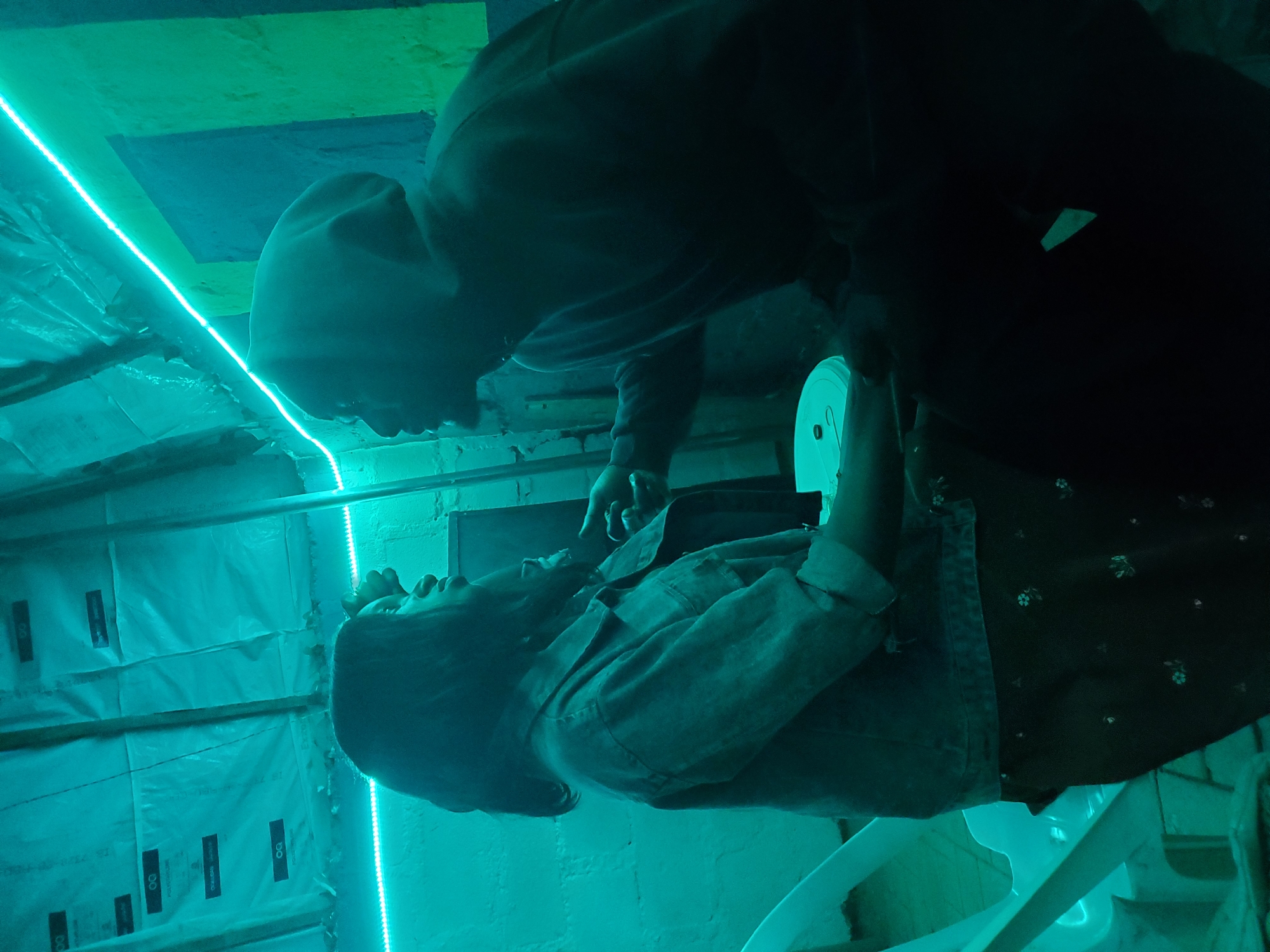 Two individuals are facing each other in an indoor space lit with blue LED strip lights