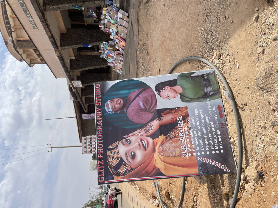 The image captures an urban street scene in Jos, Nigeria, focusing on a commercial advertisement under an overcast sky