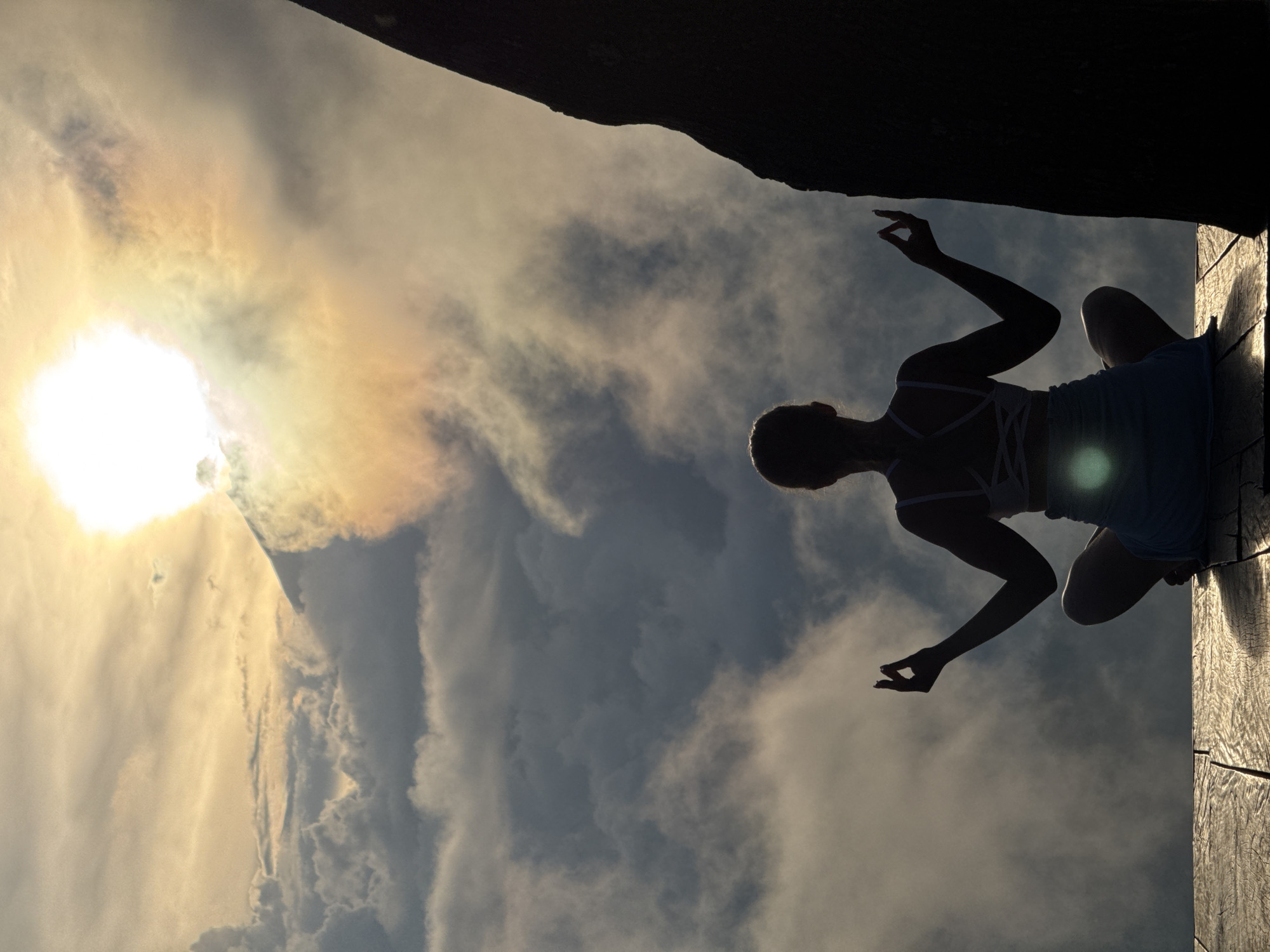 The image depicts a silhouette of a person in a meditative pose on a wooden structure against a cloudy sky with the sun visible