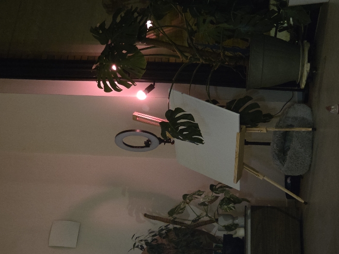 An indoor scene in Eeklo, Belgium, depicts a corner room under low, artificial lighting. A wooden tripod easel stands centrally, supporting a blank white canvas. A large, dark green leaf from a Monstera plant partially overlays the upper right corner of the canvas. Behind the easel, a black ring light is positioned to the left of a vertical, reddish-orange LED bar light. To the right, a spherical light bulb emits a strong pink-red glow, illuminating the adjacent white wall and a large potted Monstera plant situated near a dark vertical panel, likely a window frame or door. On the far left, a low, dark-toned wooden cabinet holds several smaller potted plants, one exhibiting variegated leaves. A square white fixture is mounted on the upper left wall. A grey, fluffy pet bed rests on the floor beneath the easel. A small, red-capped object is visible on the floor in the foreground. No individuals are present.