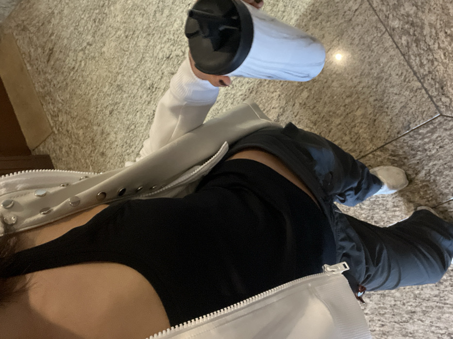 A person wearing a white jacket, black shirt and dark pants holds a white marble patterned tumbler. The image is taken from a high angle, focusing on the torso and legs of the individual. The background is a speckled floor. The jacket has silver studded detailing, and white socks are visible on the feet. The tumbler has a black lid with a straw.