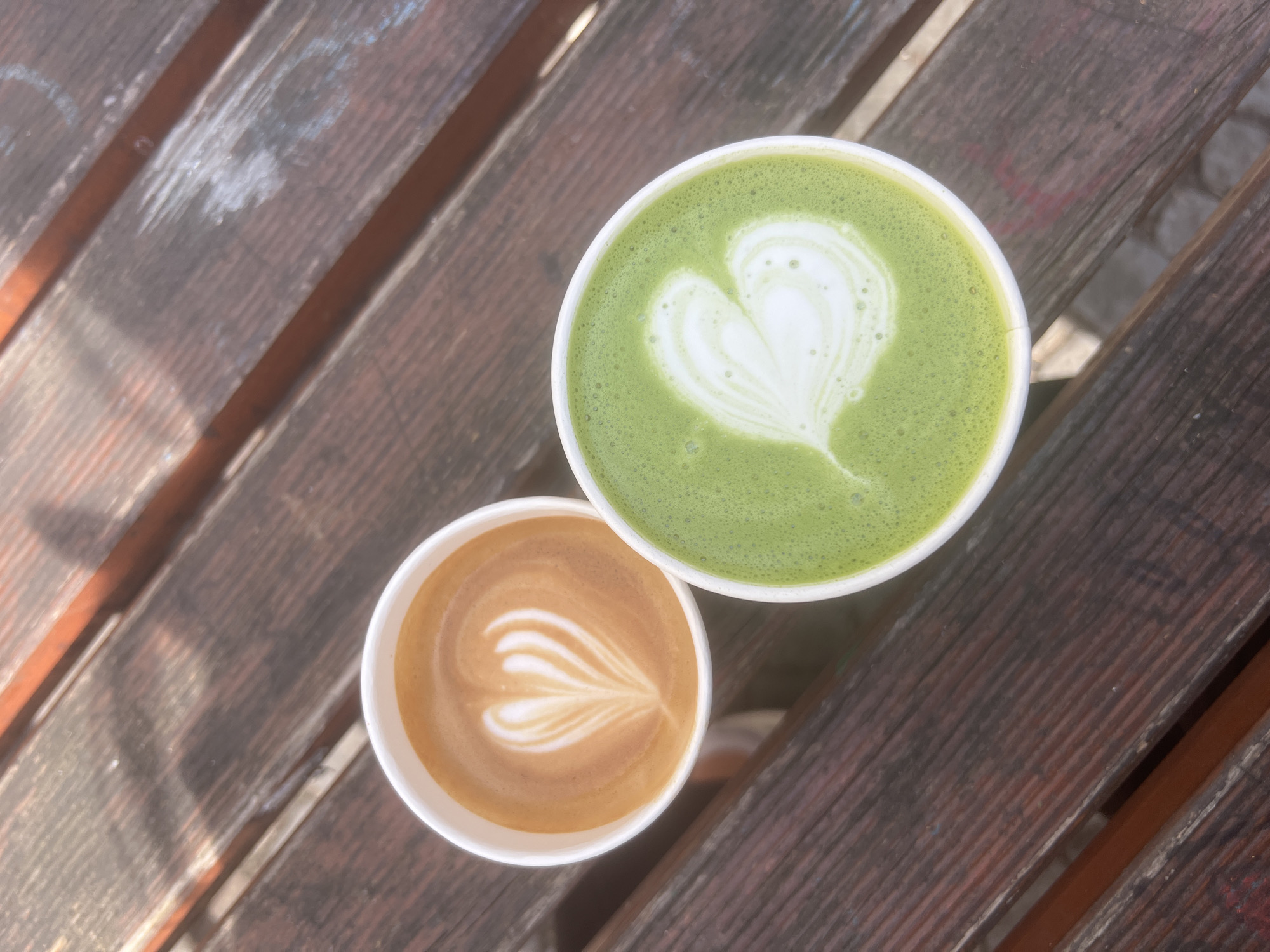 An outdoor setting in Vienna, Austria, likely a cafe patio or public bench, is depicted from a top-down perspective. Two white, disposable paper cups, each containing a beverage with latte art, rest on a weathered wooden surface composed of parallel dark brown planks. The cup on the left contains a coffee latte, identifiable by a white foam heart design against the light brown liquid. The cup on the right holds a matcha latte, displaying a white foam heart pattern contrasting with its vibrant green liquid. The wooden surface shows signs of wear, including faded areas, minor abrasions, and faint residue marks. Strong overhead sunlight creates distinct shadows across the planks. No individuals, actions, or interactions are visible within the frame.