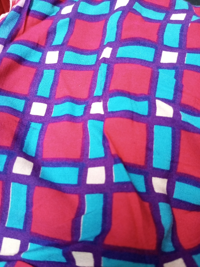 The image depicts a textile with a vibrant, abstract grid pattern. The grid consists of purple lines that form uneven squares. Inside the squares, there are alternating blocks of red and teal. Small white squares are interspersed randomly at the intersections of the purple gridlines. The fabric has folds and wrinkles, giving the surface a textured appearance. The colors are rich and saturated.