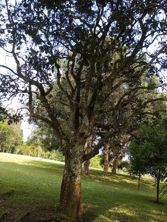 This scene, located in New Serchhip, India, depicts an outdoor natural environment. A large, mature tree occupies the central and left foreground, featuring a thick, irregular trunk with mottled brown bark extensively covered in patches of light green lichen. Numerous gnarled branches extend upwards and outwards, forming a dense canopy with sparse dark green leaves visible against a bright, partially visible sky. The tree is situated on a gently sloping expanse of short, vibrant green grass, illuminated by natural sunlight that casts areas of shadow. In the midground and background, several other mature trees with similar characteristics are visible, alongside a smaller, densely leafed tree positioned to the right. A distant treeline forms the horizon. No human subjects or discernible actions are present within the frame.