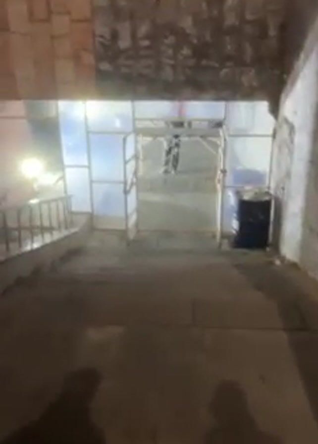 set of stone stairs leading down to a fenced-off area. The fence is made of a light-colored frame with translucent panels. Behind the fence, a person in dark clothing walks across what appears to be a paved area. To the right of the stairs, there is a dark barrel. The walls on either side of the stairs are made of stone. The lighting is dim, and the shadows of the people filming are visible at the bottom of the frame. It appears to be nighttime.