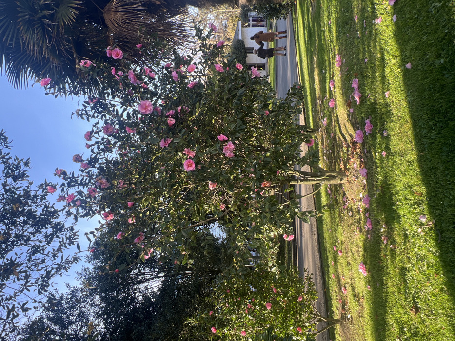 The image depicts a park or garden scene in La Coruña, Spain, under clear, bright daylight. In the foreground, a prominent Camellia japonica tree, approximately 3-4 meters tall, is laden with numerous open pink blossoms and dark green foliage. A significant quantity of detached pink petals lies scattered across the vibrant green grass beneath this tree and extending into the lower left frame. To the immediate left, a smaller camellia bush, also blooming with pink flowers, is visible. In the mid-ground, two adult individuals are walking from left to right on a paved pathway or road. The person on the left wears a light-colored top and dark trousers, while the person on the right wears a long, light tan-colored coat. They are walking in close proximity, appearing to interact, with the person in the tan coat positioned slightly behind the other. Further in the background, behind the pathway, a partial view of a white, single-story building with a dark roof and a white picket fence is observable. Dense, darker green foliage from other trees forms a background on the left, while a large palm tree trunk and fronds are visible on the far right. The sky is clear blue. Strong sunlight illuminates the scene, creating distinct shadows on the grass, indicative of morning or late afternoon.