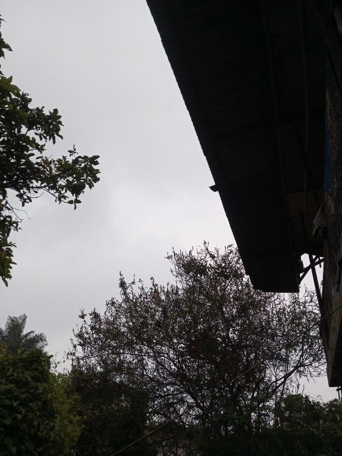 The image, captured in Ivato, Madagascar, presents an upward-looking view under an overcast, grey sky. In the upper right quadrant, a dark, corrugated metal roof overhang extends horizontally from a building structure. Adjacent to and below the roof, a section of a weathered building wall is visible, exhibiting dark textures and faint hints of blue and white discoloration. Support elements are partially visible beneath the roofline. The left and lower portions of the frame are filled with various types of foliage. A large, dark-toned tree with numerous bare or sparsely leafed branches and clusters of small, dark red or brown inflorescences occupies the central-lower-right. In the upper left, a branch of a tree with dark green leaves is present. Toward the lower left, fronds of a palm tree are discernible amidst other dense, dark green vegetation. A thin, dark line, possibly a utility wire, stretches horizontally across the lower-middle section of the image, passing through the tree canopy. No individuals or discernible actions are present.