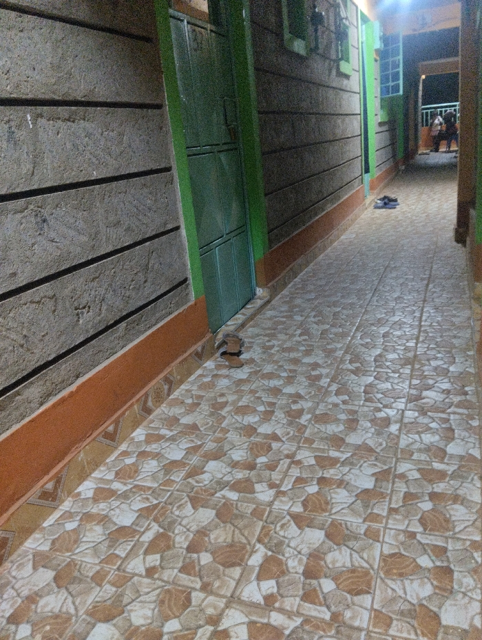 A narrow, tiled corridor extends into the distance. The walls are textured, alternating between a grey, rough surface and a dark, smooth material. Doors are framed in green. Pairs of shoes sit on the floor near the doors. Faintly visible in the distance are figures on a balcony or patio. The overall lighting is dim.