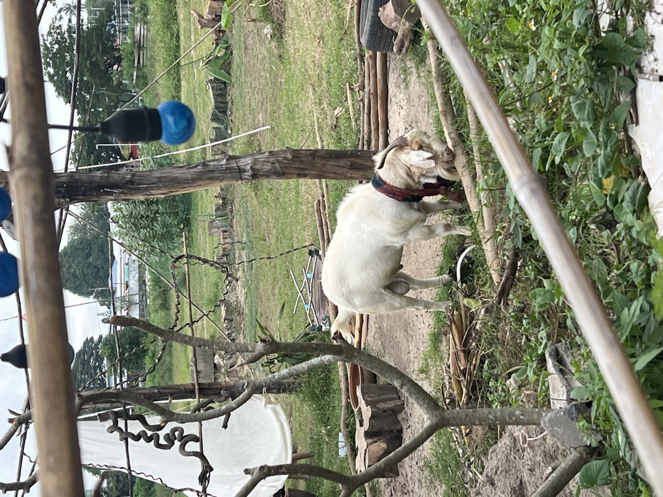 The image portrays an outdoor scene within a semi-rural or undeveloped area of Baan Chaweng, Thailand, under an overcast sky. A large, robust white male goat with prominent testicles and curved horns is centrally positioned, facing right, with its head lowered, appearing to graze on ground vegetation or chew a fallen branch. A red and green plaid scarf is loosely tied around the goat's neck. The immediate ground around the goat is a mix of sparse green grass, bare earth, and scattered organic debris including small branches. To the right of the goat, a black tire rests on the ground amidst other discarded wooden elements. In the midground, a rustic, open-air structure constructed from rough wooden posts and horizontal beams is visible. Several spherical blue light bulbs, suspended by black wires, hang from this structure. A white sheet or fabric is draped over the structure on the far left, and dark, coiled vines or branches are interwoven around its supports. Multiple cut tree stumps are present, particularly behind and to the left of the goat. The foreground is partially obstructed by a diagonal bamboo pole extending across the bottom right and a blurry, multi-branched tree-like element on the left. Beyond the immediate clearing, the background features an expanse of green foliage, mature trees, and in the far distance, indistinct buildings with light-colored walls and darker roofs under the cloudy sky. A faint blue structural detail is visible in the distant background, left of center.