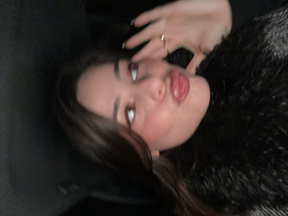 A blurry, tilted close-up shot depicts a woman with dark hair, making a duck face with her tongue slightly visible. She has fair skin with flushed cheeks, wearing a dark, possibly furry, garment. Her right hand is raised, fingers slightly spread apart, displaying a gold ring. The background fades into darkness, possibly indicating an indoor setting with poor lighting.