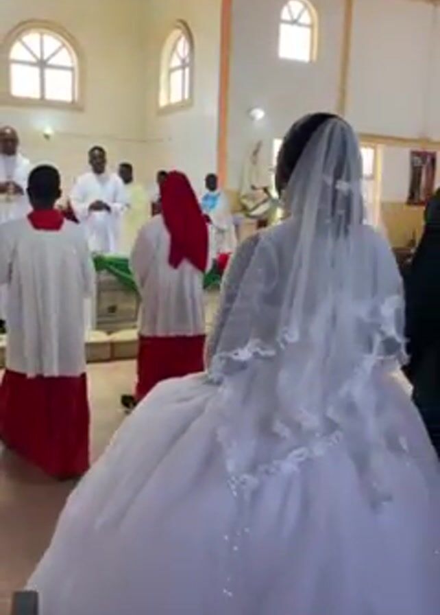 In a brightly lit church with beige walls, a bride wearing a large white ball gown and a long veil walks down the aisle. A man in a dark suit accompanies her. They are walking towards a raised altar area where several men in white robes and a few in red robes are standing. The altar area is decorated with green and red fabric. There are arched windows on the left side of the frame, and a painting of Jesus on the right side. The aisle is tiled and the video is shot from behind the bride.