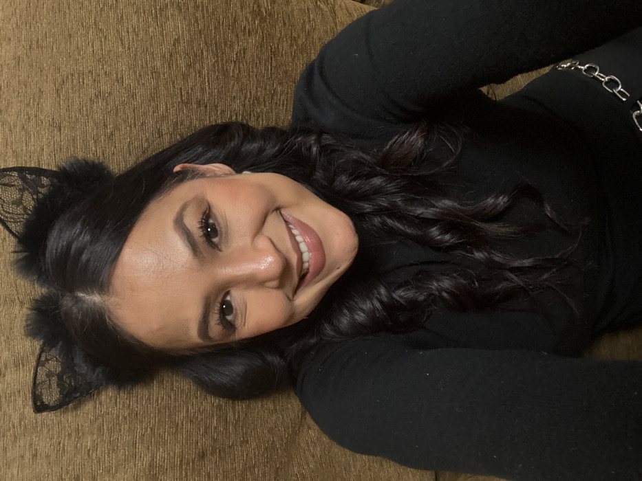 An image taken in Burjassot, Spain, depicts a female individual with dark, wavy hair and medium-tan skin, looking directly at the camera with a broad smile. She wears a black long-sleeved top, possibly a turtleneck, and a black headband featuring fuzzy cat ears with a lace overlay. A silver-colored chain belt with interconnected links is visible on her lower right side. A light-colored earring is present in her right ear. The subject's makeup includes eyeliner, mascara, and a reddish-brown lip color. The background consists of a uniform, textured warm brown fabric, likely upholstery. The perspective suggests a selfie, with the subject positioned from an upward angle.