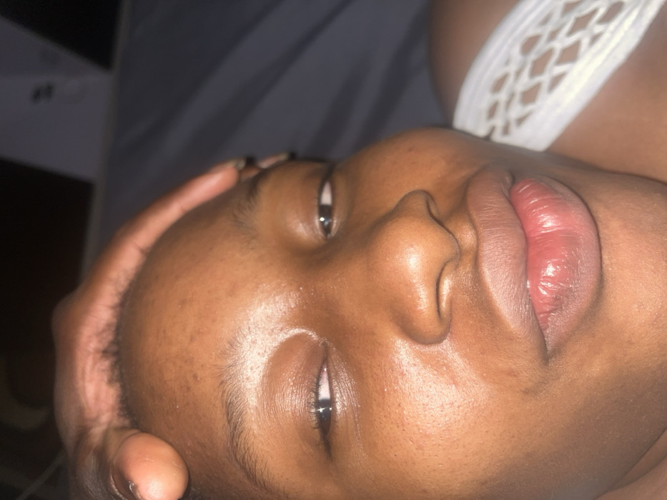 A close-up image depicts an individual with dark skin, positioned at a slight upward angle