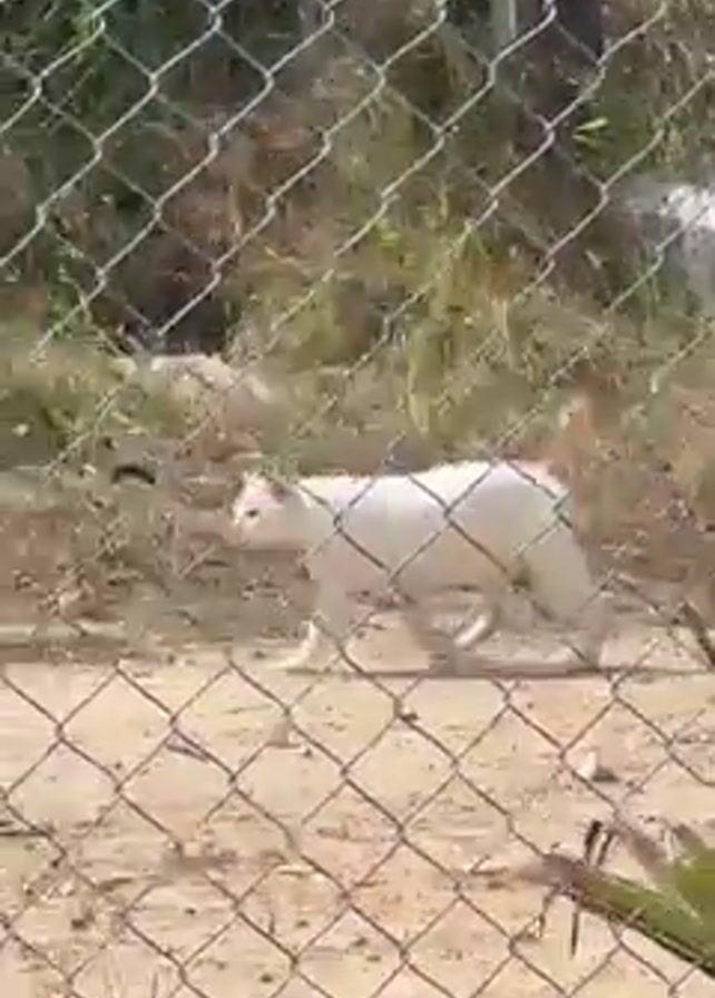 A full shot of a white cat walking inside a fenced area on a sunny day