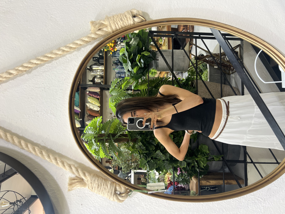 A woman is reflected in an oval, gold-rimmed mirror hanging on a white wall. She's taking a selfie, holding her phone up. The mirror's rope hanger is visible on the left. The reflection behind her shows a retail space with plants, shelves stocked with goods, and a staircase. She is wearing a black tank top and a white skirt with a thin brown belt. The mirror captures the surrounding store ambiance.