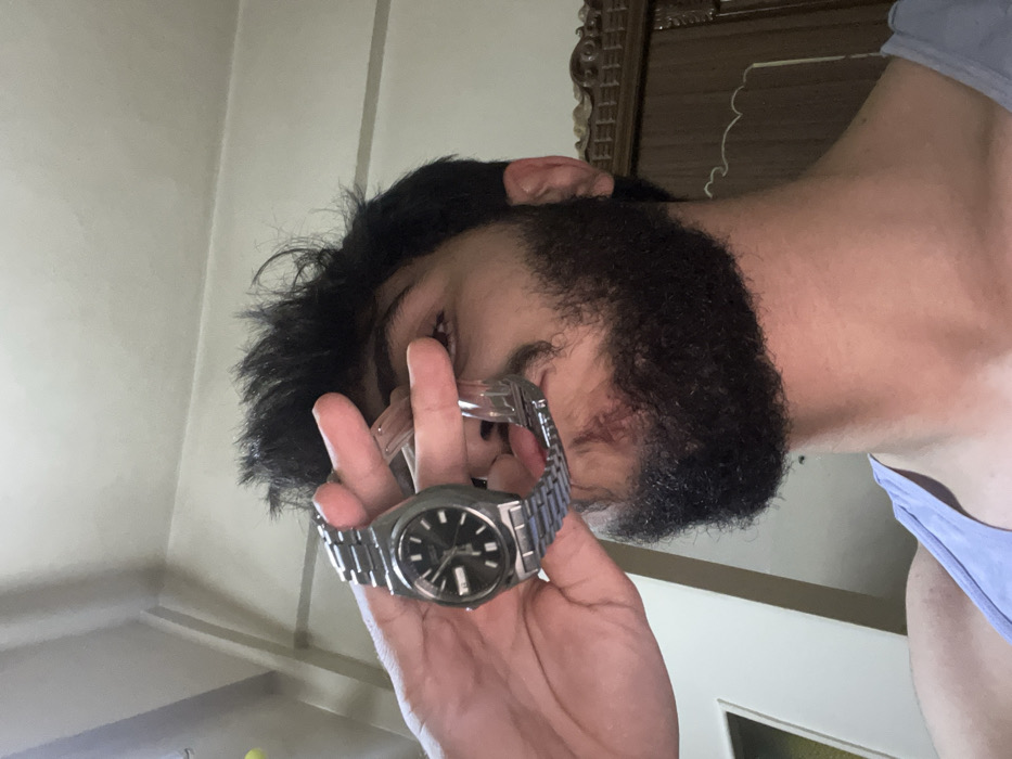 A person with dark, curly hair and a thick beard is holding a silver watch. The watch has a black face and a metal band. The person is wearing a light blue tank top. Behind the person is a light-colored wall and a dark wooden frame. The photo is taken from a low angle, looking up at the person.