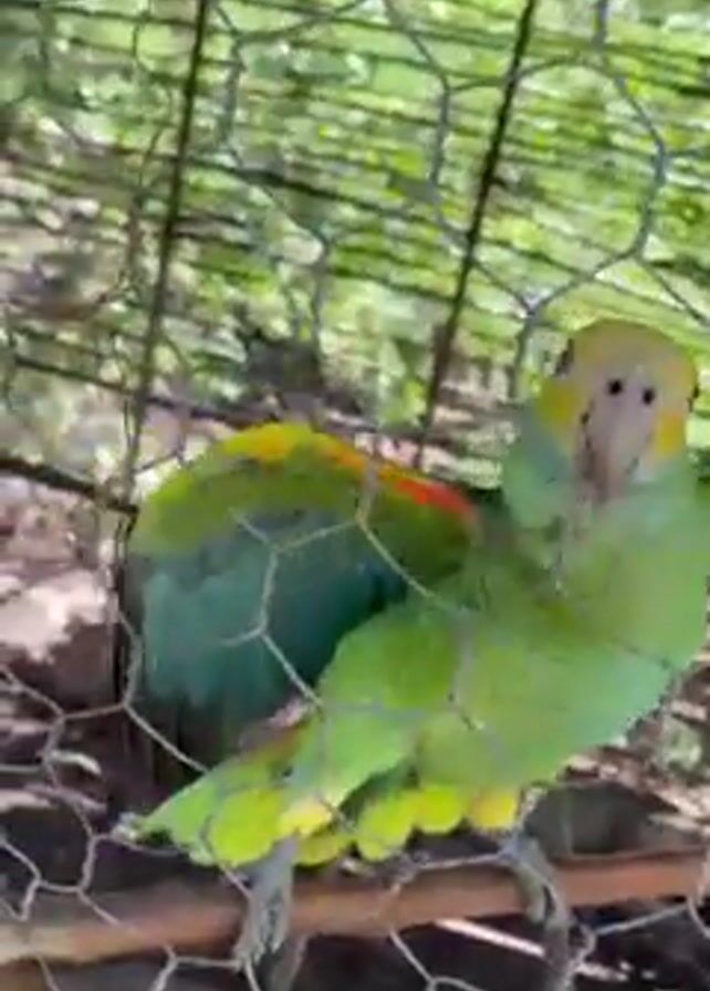 parrot in a wire cage. The parrot is predominantly green, with yellow on its head and hints of red and blue on its wings. It is perched on a wooden branch. A voice says "Hola," and the parrot responds with a squawk. The parrot then repeats the words "Corre, corre, corre, corre." The background is blurry, but appears to be a wooded area.