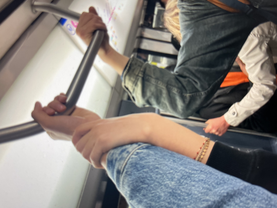 This image depicts a crowded interior of a public transport vehicle, likely a metro or train, in the city of Ivry-sur-Seine, France. The environment features a white ceiling with integrated lighting, polished metallic overhead grab rails, and a partially visible, blurry line map on an interior panel. In the foreground, two hands are centrally positioned, grasping one of the horizontal metallic grab rails. The lower hand belongs to an individual wearing a light blue denim jacket, with a black long-sleeved garment visible beneath the cuff. Two multi-strand beaded bracelets, one red and one gold-toned, are present on this individual's wrist. A second hand is positioned directly over the first, gripping both the initial hand and the grab rail. To the right, a third individual's arm, clad in a darker-toned denim jacket, also grasps the same overhead grab rail. Below this arm, a fourth person's arm, wearing a white long-sleeved shirt with buttoned cuffs, is visible holding a vertical handrail or support. An orange garment is partially visible behind this arm, possibly belonging to another passenger. The upper portion of a head with blonde or light brown hair is visible at the far right edge of the frame. All visible individuals are utilizing the vehicle's handholds for stability.