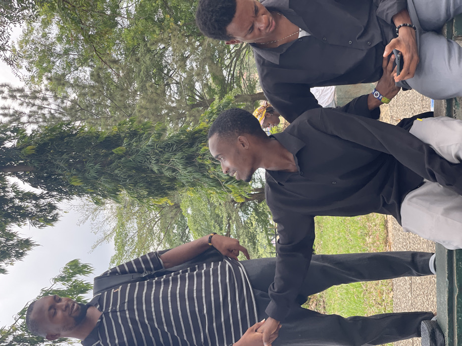 An outdoor scene in Uturu, Nigeria, depicts three males and one partially visible female amidst lush green foliage and trees under an overcast sky. In the foreground, a standing male, dressed in a black and white striped polo shirt and dark trousers, wears a black backpack and a beaded bracelet on his left wrist. He is engaged in a handshake with a seated male to his right, who is wearing a black long-sleeve button-up shirt and light grey trousers, with a watch on his left wrist. This seated male looks upward and to the left, smiling. To the right of the handshake, another seated male, also in a black long-sleeve button-up shirt and dark grey trousers, holds a black smartphone in both hands, gazing down at the device. He wears a beaded bracelet on his right wrist and a silver chain. A female individual with a patterned headscarf and white top is partially visible in the background between the two seated males. The ground consists of green grass and a concrete edge where the individuals are seated.