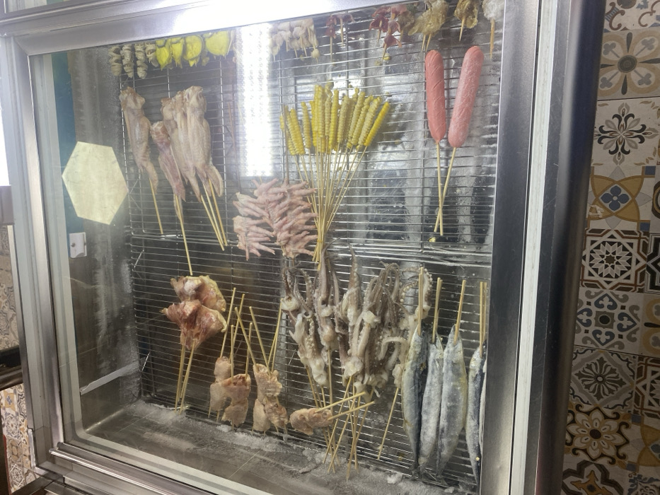 A refrigerated display case features an array of food items on skewers. Visible are chicken wings, chicken feet, corn, sausages, octopus, fish, and various meats. The skewers are arranged on shelves within the case. Some frost or condensation is present on the glass and surfaces inside. The background includes tiled walls with ornate patterns.