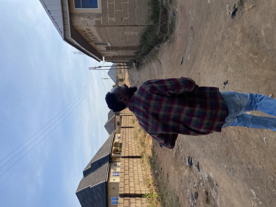 A man stands on a dirt road between two rows of houses. He's facing away from the camera, wearing a red and blue plaid shirt and light-wash jeans. The houses are made of tan bricks, with dark roofs. A blue sky with thin white clouds overhead. Power lines stretch across the sky between the buildings. The ground is littered with debris. The photo appears to have been taken on a sunny day.