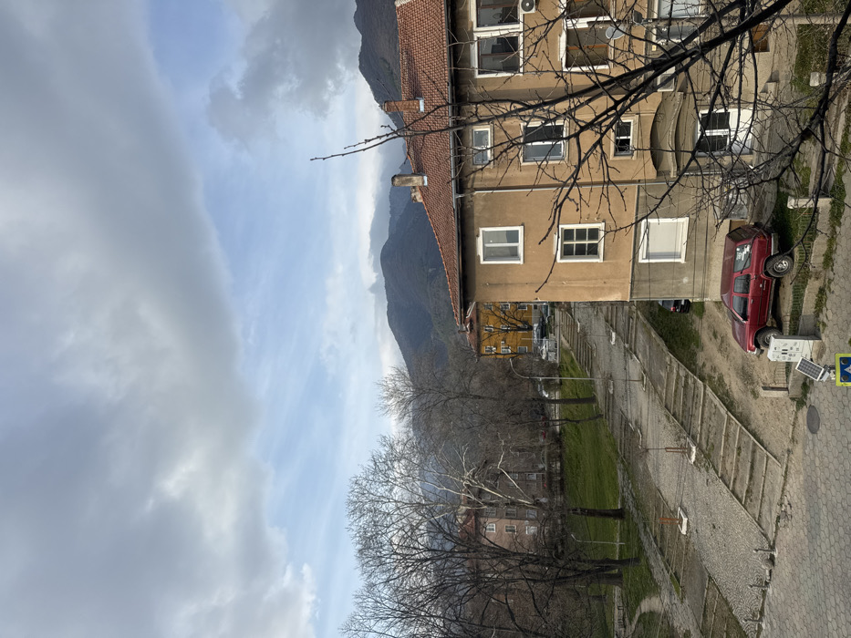 An elevated view captures a residential area in Sopot, Bulgaria, under a partially overcast sky. In the immediate foreground, dark, bare tree branches extend from the right. The lower right features a multi-story building with a light brown facade and a reddish-brown tiled roof, multiple white-framed windows, and two visible chimneys. Below this building, a red four-door SUV is parked on a dirt patch adjacent to a paved area. A small white utility box with an attached solar panel stands near the SUV and the paved surface. Ascending from the lower-center is a wide, terraced pathway or staircase system, composed of concrete or stone steps interspersed with flat sections. This path is flanked by grassy slopes and numerous bare deciduous trees, suggesting a season without foliage. In the midground, to the left of the path, stands a multi-story building with a light reddish-brown facade. Further up the slope and to the right of the path, a bright yellow multi-story building is partially visible, with several parked cars on a street in front of it. The background is dominated by a range of dark, rugged mountains, appearing hazy under the cloudy conditions, which transition into a lighter blue sky with scattered clouds above. No individuals are visible within the frame.