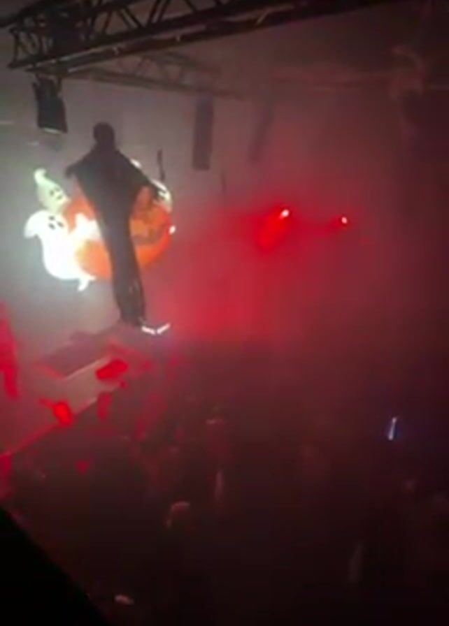 From a high angle, the video shows a crowded concert venue lit in red. A performer stands on a raised platform, behind him is a large inflatable prop featuring a pumpkin and a ghost. The crowd below appears to be enjoying the performance, with some holding up phones. The ceiling is visible, showing metal beams and lighting fixtures. The overall atmosphere suggests an energetic and possibly Halloween-themed event.