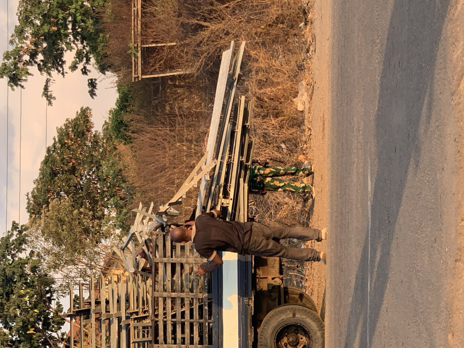 A man in a black shirt and jeans is on a flatbed trailer loaded with metal beams, next to a road. A person in camouflage clothing lies on the ground nearby, next to some metal beams and dry vegetation. The road is asphalt and stretches along the side. Trees and some buildings are visible in the background.