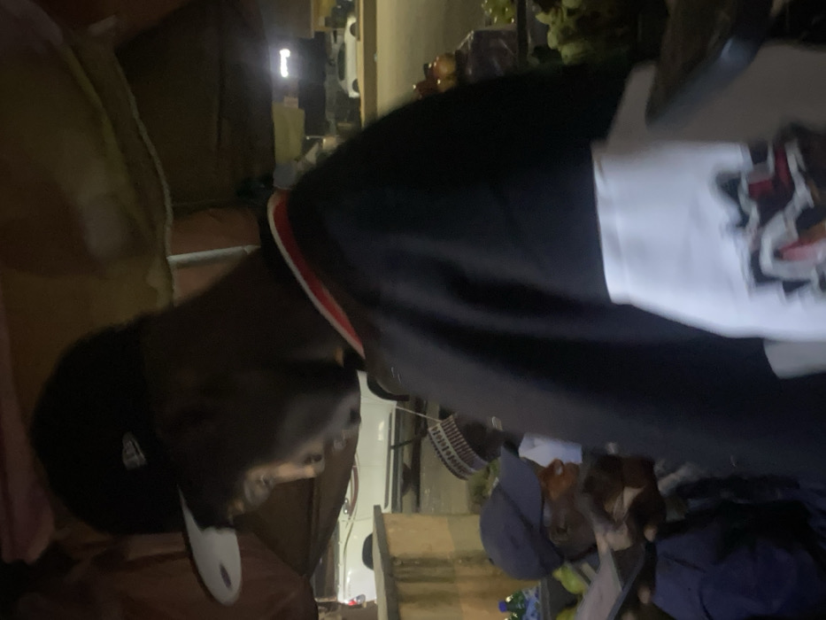 This image captures a dimly lit, active street market scene in Jos, Nigeria, likely during evening or nighttime hours. In the foreground, a person is partially visible, facing left and looking downwards. They wear a black baseball cap with a white brim featuring a white logo, and a dark long-sleeved top with a prominent red and white stripe on the collar. A white section with an abstract graphic design is visible on the lower right of their garment. Behind this individual, under a draped, light brown canopy or awning, several other people are present. To the left, a man in a dark blue baseball cap is engrossed in a smartphone or similar device, which he holds in both hands. Behind him, another individual wears a traditional patterned cap and a light-colored tunic. To the right of these individuals, on a display surface, green leafy produce is visible. In the background, beyond the immediate market activity, a paved road is discernable. A white pickup truck is partially visible on the left, behind a low, light-colored barrier. Further to the right, a white sedan is parked across the road, illuminated by a distant artificial light source. The overall environment suggests a vibrant commercial area.