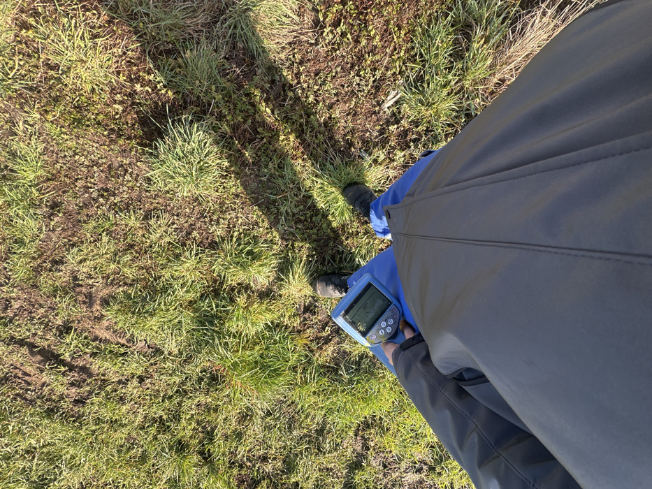 An overhead, first-person perspective captures a scene in Lambres-lez-Douai, France. The subject, a person, is partially visible from the torso down, wearing a dark grey or black coat, blue trousers, and dark footwear. The left hand holds a light blue or grey handheld electronic device, possibly a utility locator or data logger, which displays a graphical interface on its screen and features multiple control buttons. The individual is standing on uneven ground characterized by patches of green grass and exposed brown earth. Strong sunlight from the left casts distinct, elongated shadows of the subject and their legs onto the ground to the right.