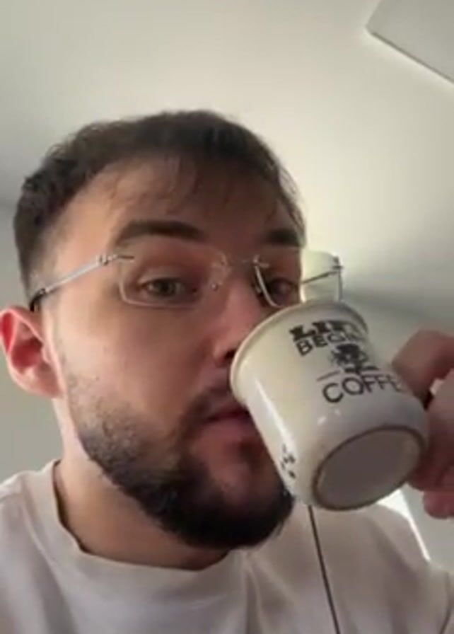 A man with a light complexion, short dark hair, and a trimmed beard is holding a white ceramic mug in his right hand. He is wearing rimless glasses and a white t-shirt. He raises the mug to his lips and takes a drink. The mug has the phrase "LIFE BEGINS" printed on it. A black wire is visible near his right ear, potentially indicating headphones or earbuds. The background is plain and slightly out of focus, suggesting an indoor setting. A square light fixture is visible on the ceiling in the upper right corner of the frame.