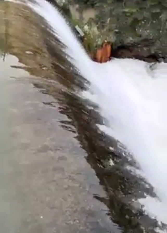 The video pans from still, gray water over a shallow man-made dam to where the water cascades down a short, steep waterfall