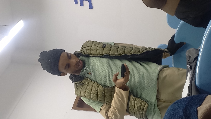 A person wearing a black beanie, a light green patterned shirt, and a tan vest is holding a mobile phone. They are sitting on a blue plastic chair in a waiting room-like area with light-colored walls. Other blue chairs are visible nearby, some with jackets draped over them. A bright fluorescent light is seen on the ceiling.