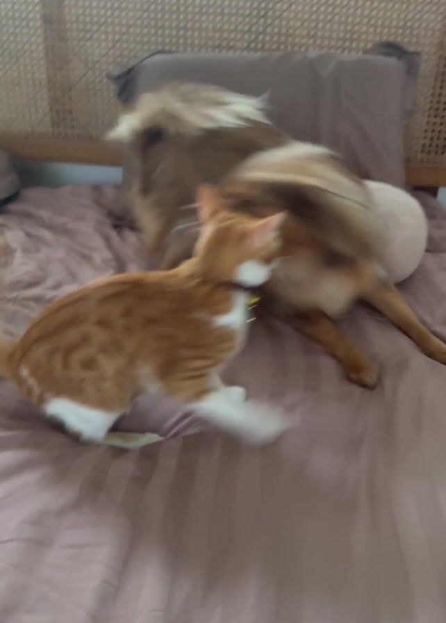 small tan and white dog and an orange tabby cat playing on a bed covered with a light-brown or mauve duvet. The dog initially stands over the cat. The cat jumps up and the two animals circle and pounce at each other. They both roll over, with the cat ending up sitting beside the dog while the dog scratches its belly. A bedframe made of a light-colored woven material is visible behind the animals, and a nightstand with a few objects on it is seen to the left.