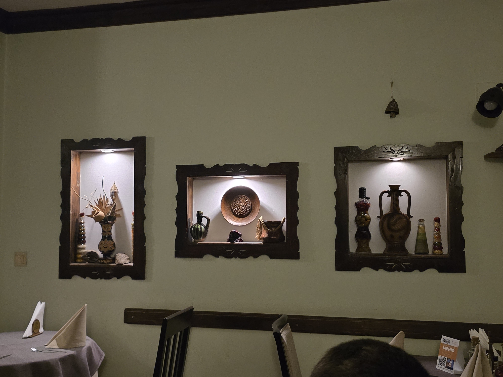 restaurant interior, likely in Berkovitsa, Bulgaria, suggested by the Cyrillic text on the menu visible on the table. The decor includes three ornately framed wall displays containing various decorative objects, such as vases, pottery, and a plate. There's a dark wooden rail running horizontally along the wall. A table with a gray tablecloth is set with napkins and cutlery in the lower left of the frame. Chairs are partially visible, and a person's head is in the foreground. A small bell is hanging on the wall between the rightmost and middle frame. A lamp is hanging in the upper right.