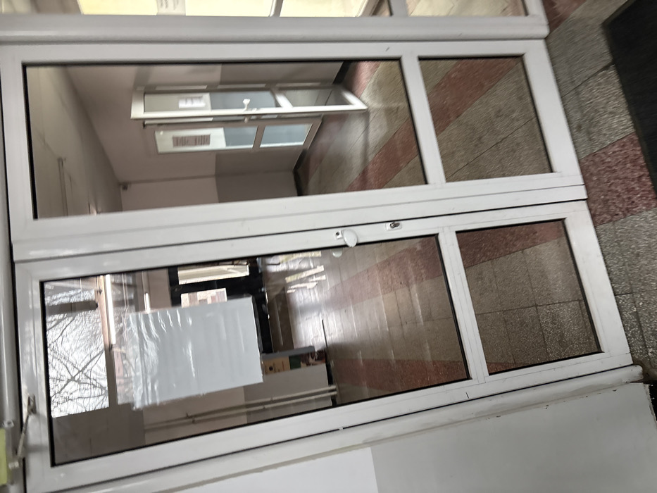 n interior view through closed white-framed double glass doors, looking down an empty hallway. The doors are composed of multiple glass panes, and a white handle/lock mechanism is present on the right door. A white hydraulic door closer is mounted above the left door. The immediate foreground floor consists of gray and reddish-brown speckled terrazzo tiles, with a partial view of a dark doormat on the lower right. Beyond the doors, a long, straight hallway is visible. Its floor features a distinctive pattern of alternating diagonal stripes of light gray and reddish-brown speckled tiles. The hallway walls are painted light gray on the bottom half and a lighter, off-white color on the top half. Fluorescent tube light fixtures are mounted on the ceiling. Further down the hallway, on the right side, another set of white-framed double glass doors stands partially ajar, revealing a glimpse into an adjoining room or corridor. A white sheet of paper or plastic is taped to the upper left glass pane of the foreground door, partially obstructing the view. Through the glass on the left, reflections or views of bare tree branches and a distant building suggest an external environment. No individuals are present in the scene. The architectural style, including the design of the doors, the two-tone wall paint, and particularly the patterned terrazzo flooring, is consistent with public institutional buildings such as universities, schools, or administrative offices in Sofia, Bulgaria, typically from the mid-to-late 20th century. While an exact address is not discernible, the environment is characteristic of such a public educational or administrative facility within the city.