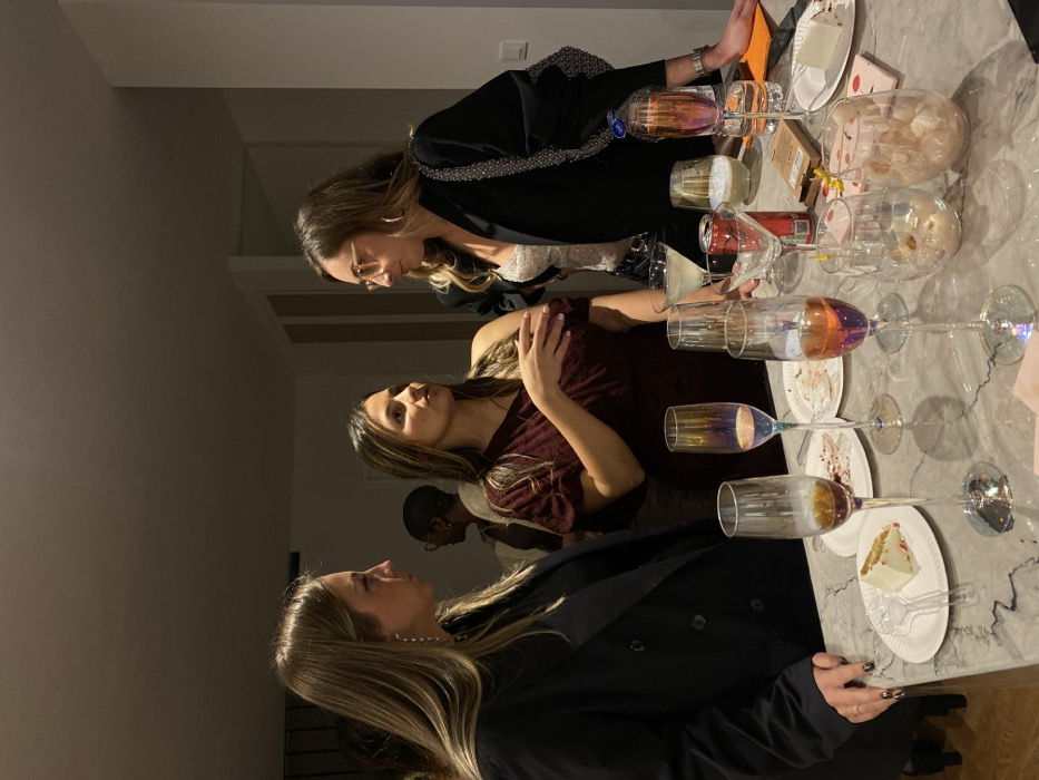 Three women stand around a marble table covered with plates of leftover cake and multiple empty wine glasses