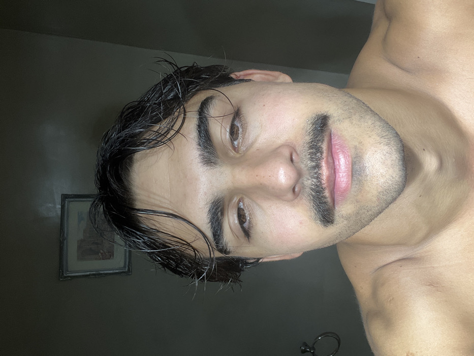 A close-up, slightly rotated headshot of a man. He has dark hair, wet and combed back, and dark eyebrows. He has a mustache and stubble on his face. His eyes are brown and slightly squinted. The background features a wall, a framed picture, and what appears to be a towel ring. His skin has a dewy appearance.